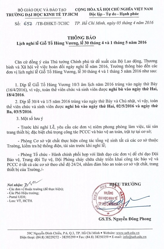 Thông báo lịch nghỉ lễ Giổ Tổ Hùng Vương, lễ 30 tháng 4 và 01 tháng 5 năm 2016