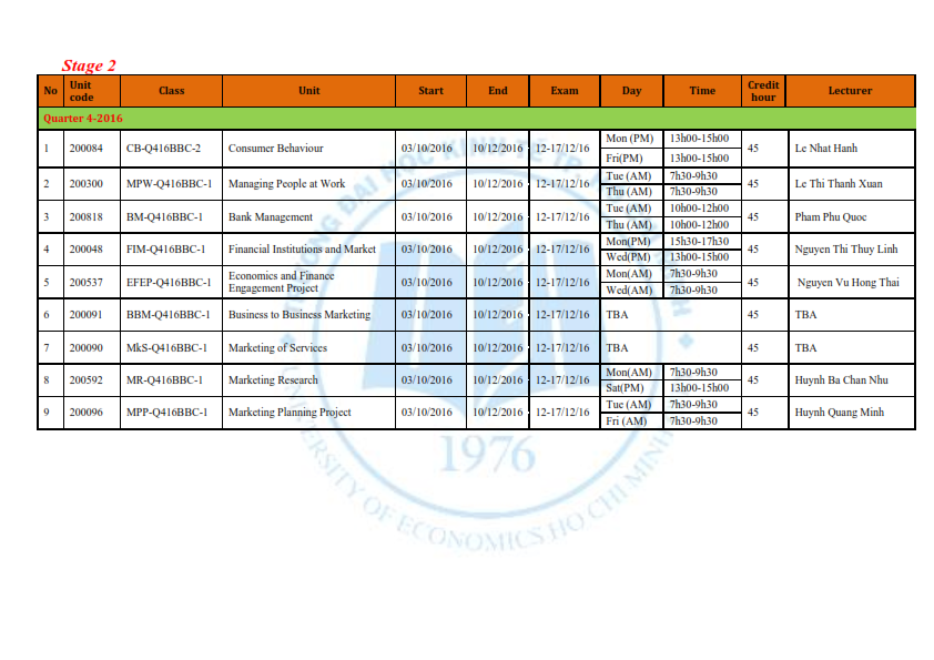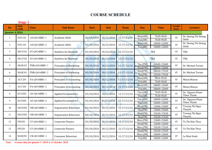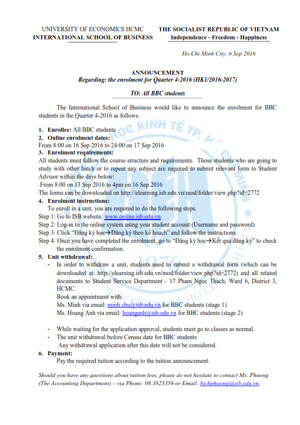 ISB.BBus -The enrolment for Quarter 4-2016 (HK1/2016-2017)