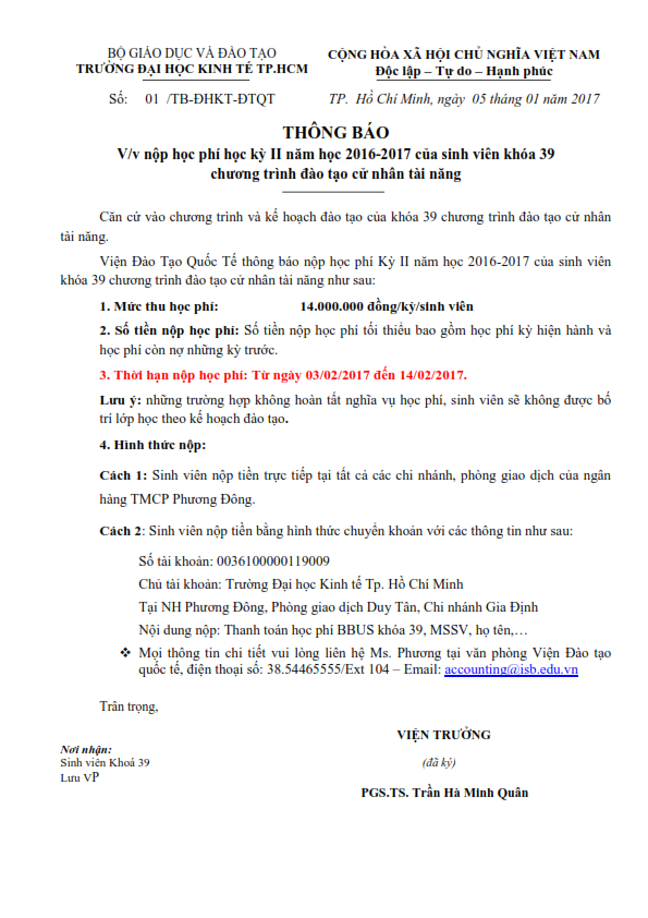 K39 - Thông báo nộp học phí học kỳ 2 năm học 2016-2017