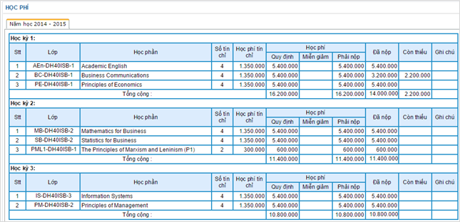 Hiển thị chi tiết thông tin học phí cho từng lớp học phần, tổng hợp học phí quy định, miễn giảm, đã nộp, còn lại,…