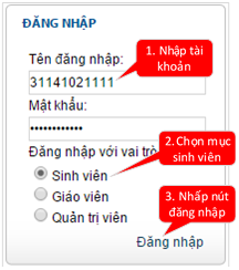 - Nhập tên tài khoản và mật khẩu, chọn mục Sinh viên và nhắp vào nút Đăng nhập để đăng nhập hệ thống.