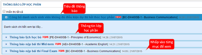 Là những nội dung do chính giảng viên giảng dạy (hoặc Phòng Đào tạo-Khảo thí) thông báo cho sinh viên các lớp học phần, chỉ những sinh viên nằm trong các lớp học phần nói trên mới xem được nội dung. Để thực hiện vào Thông báo → chọn mục Cho lớp học phần.