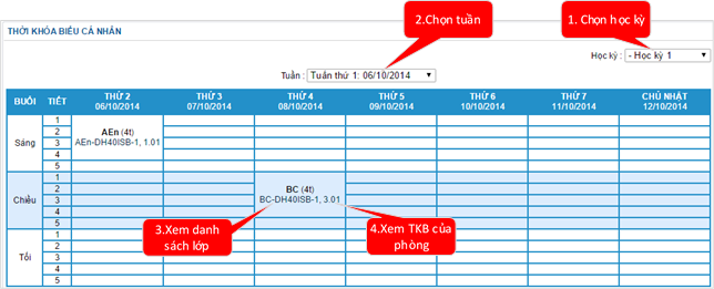 Để xem thời khóa biểu, vào Thông tin → chọn mục Thời khóa biểu. Lưu ý: sinh viên chú ý xem thời khóa biểu thường xuyên theo từng tuần, mặc định hệ thống sẽ lấy tuần hiện tại.