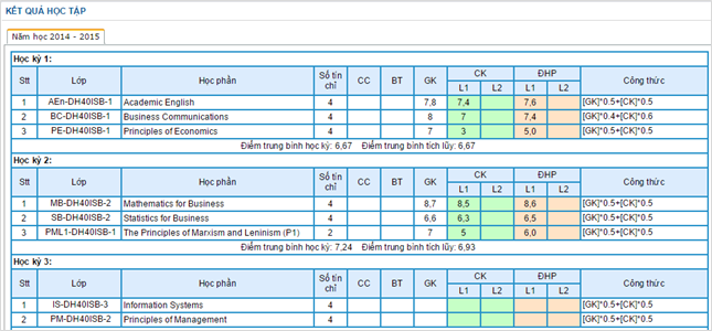Liệt kê kết quả học tập theo từng năm học, học kỳ cho sinh viên. Để thực hiện vào Thông tin → chọn mục Kết quả học tập.