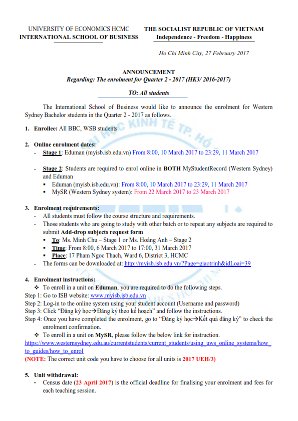 ISB.MBus The enrolment for Quarter 1-2017 (HK2/2016-2017)